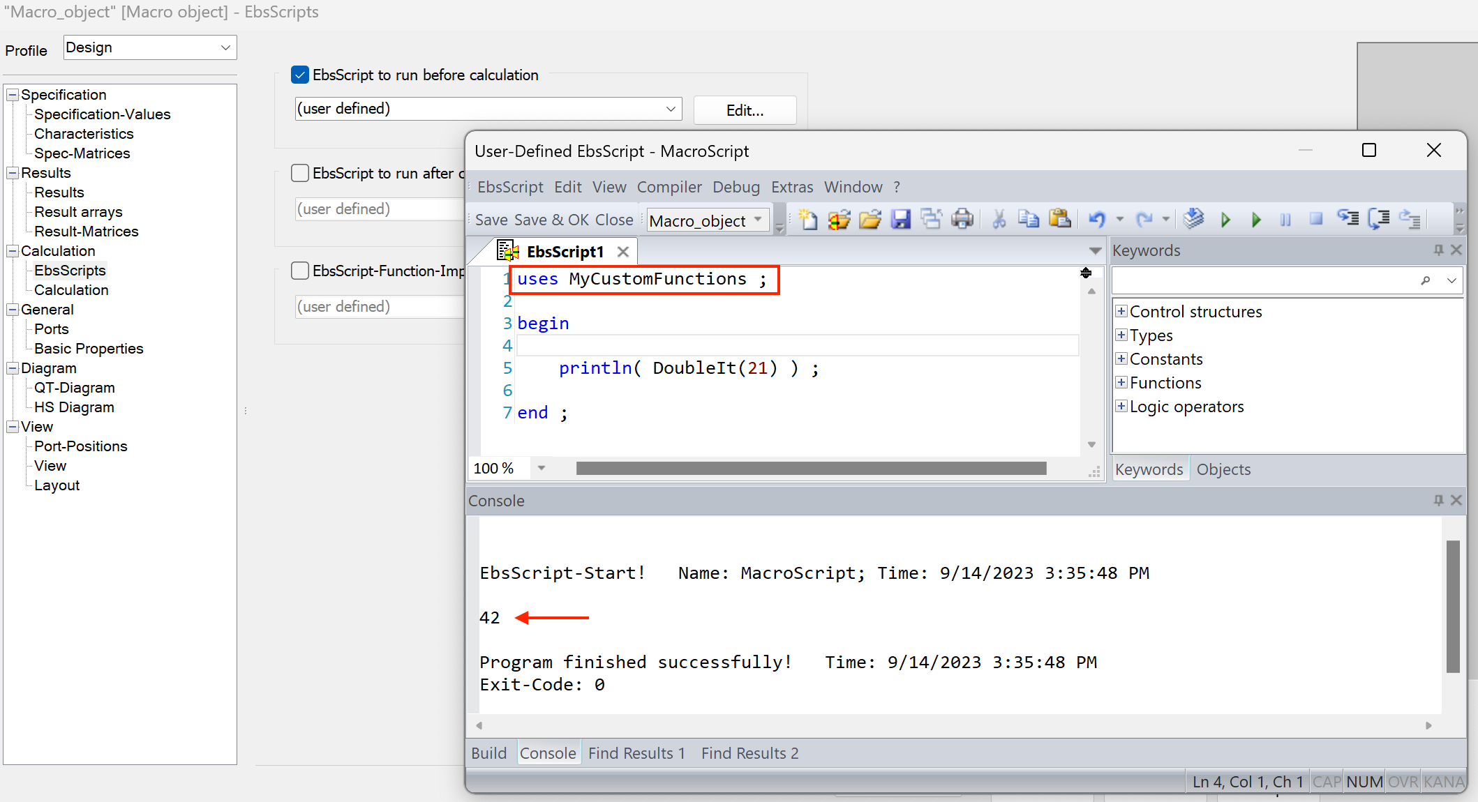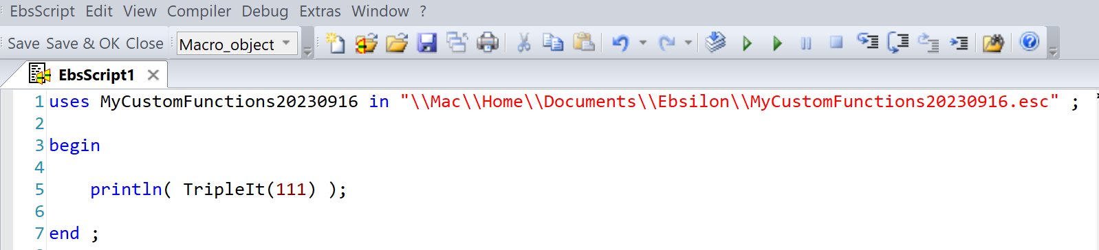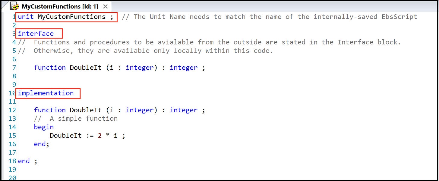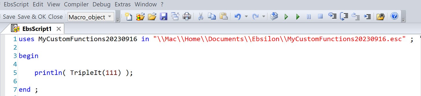 —> DoubleIt(100)To use the function in other EbsScript code, put a “uses” statement at the top of the code, with the name of the internally-saved code module: