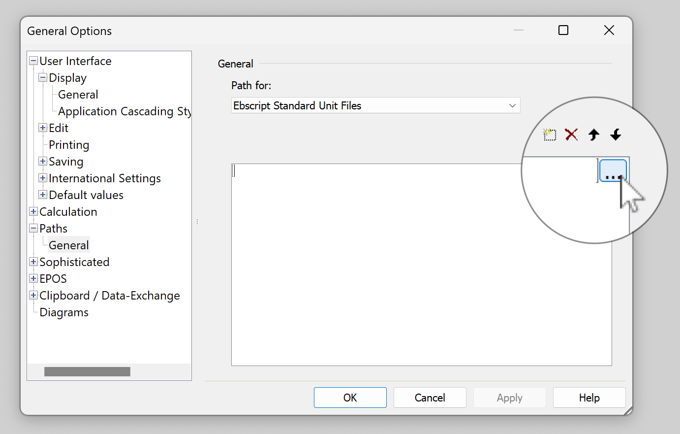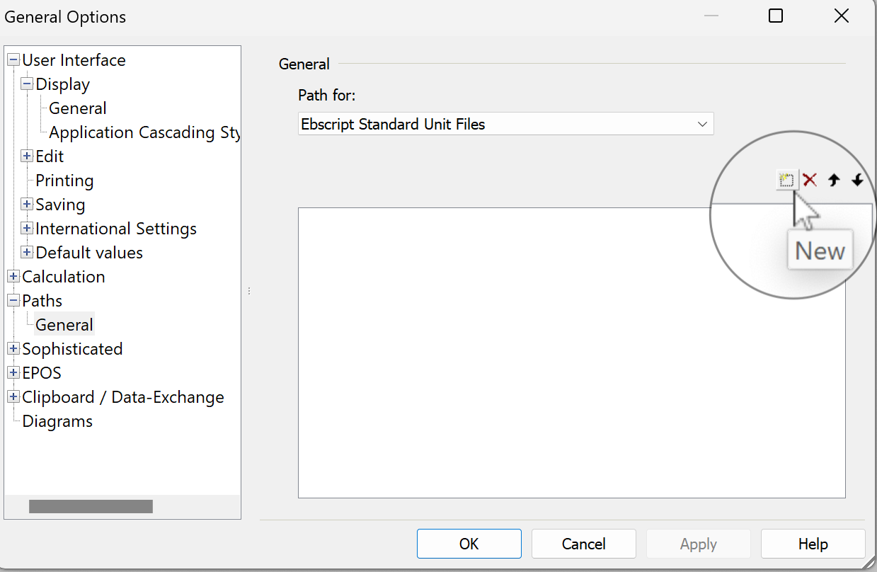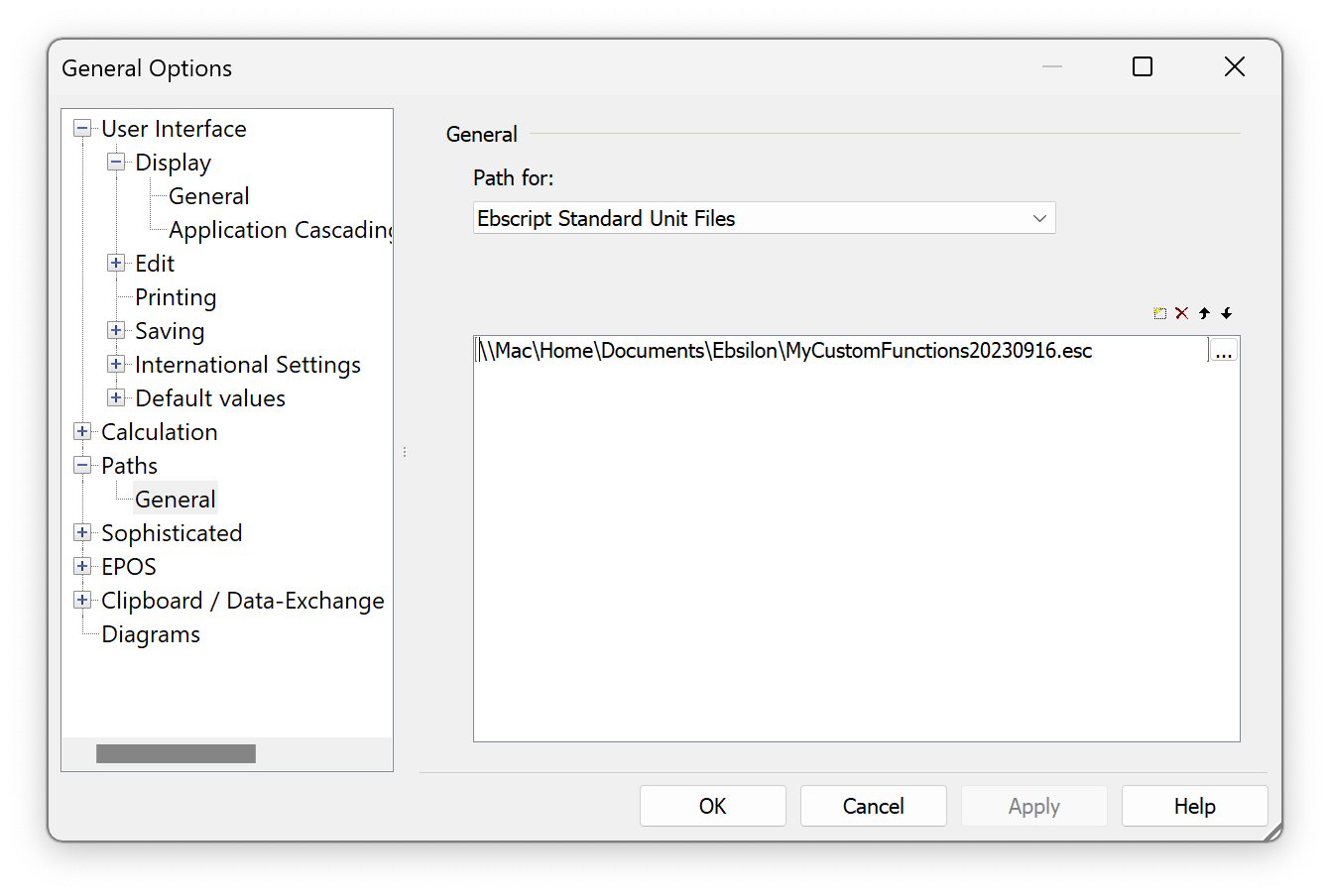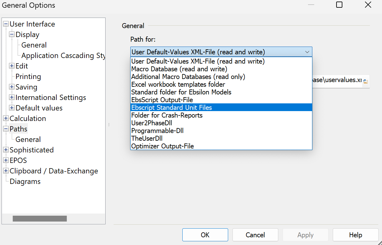 The process to make the externally-saved functions available is different vs. model-level functions. Go to the Ebsilon main menu… Extras… General Options (or the blue gear button)… Paths… Path for… and select “EbsScript Standard Unit Files”: