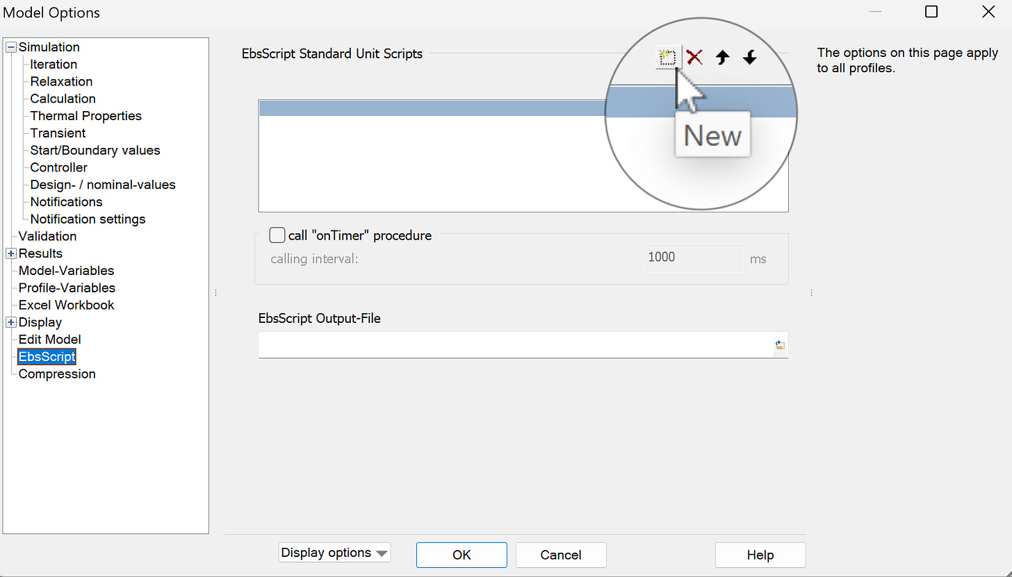On the Ebsilon main menu: Extras… Model Options (or hit the red gear)… EbsScripts. Then hit the New button.