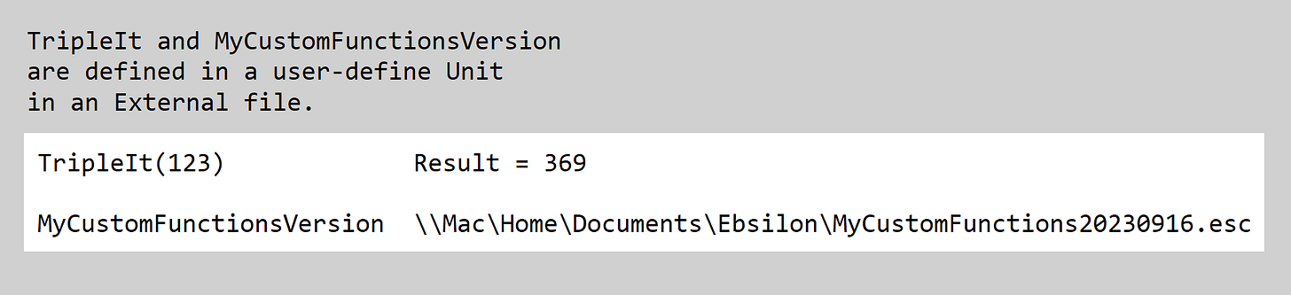 A way to get the “best of both” could be to include a date stamp to externally-saved code. I did this in my example — the file is named MyCustomFunctions20230916.esc (with the date in yyyymmdd format). If functions are updated and perhaps distributed within your organization, they can be consciously invoked by forcing users to update the application-level Path to these functions.