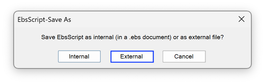 Hit the EbsScript editor on the toolbar (or hit the F8 key), then the write the code. Save it internally (you’ll be asked Where when you hit Save). Note that for internally-saved EbsScripts, the name can contain only letters (including äöêâäiçæôíó and their uppercase versions), numbers, and the _ character. Spaces are not allowed).