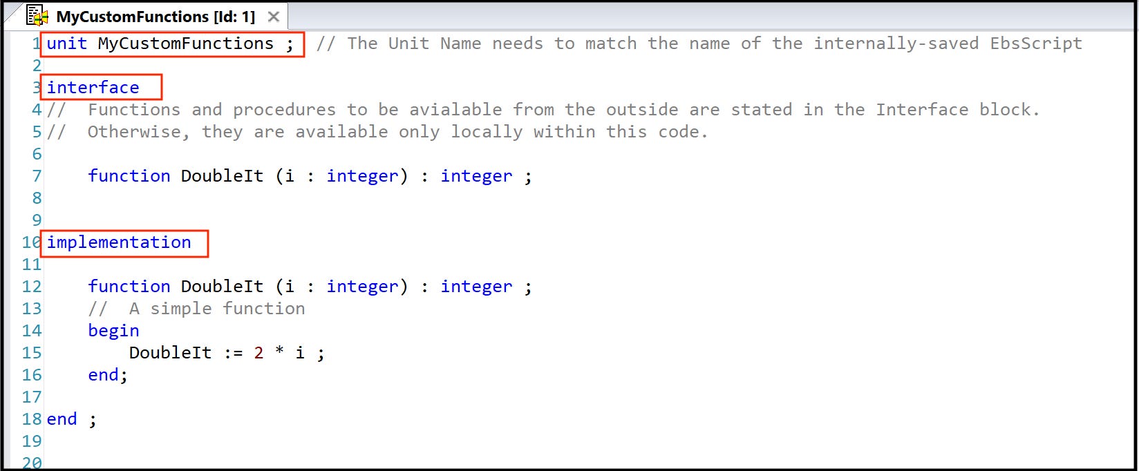 Note the three special statements, which are needed to make the DoubleIt usable outside this code module: unit, interface, and implementation (with its matching end statement at the bottom).